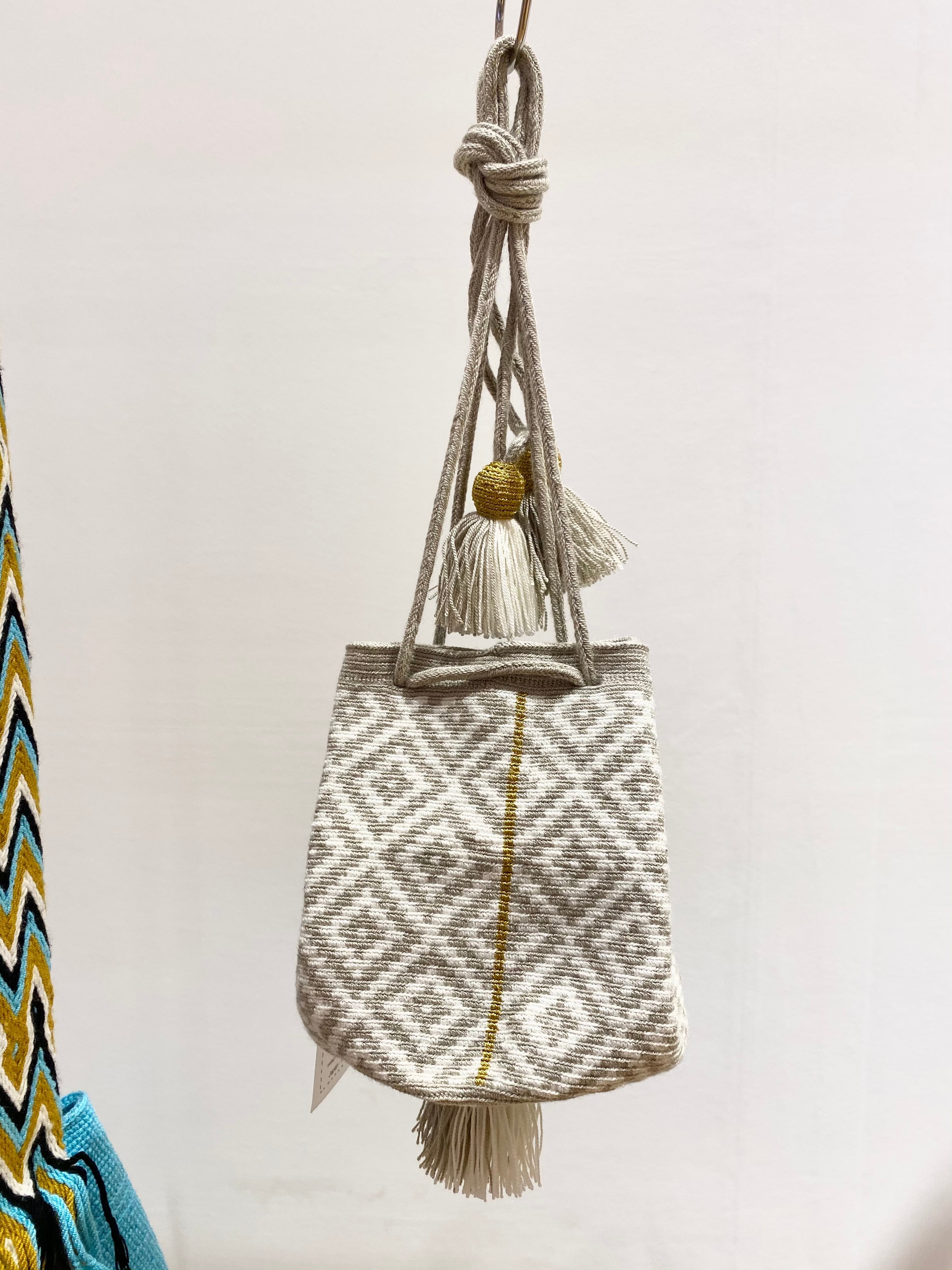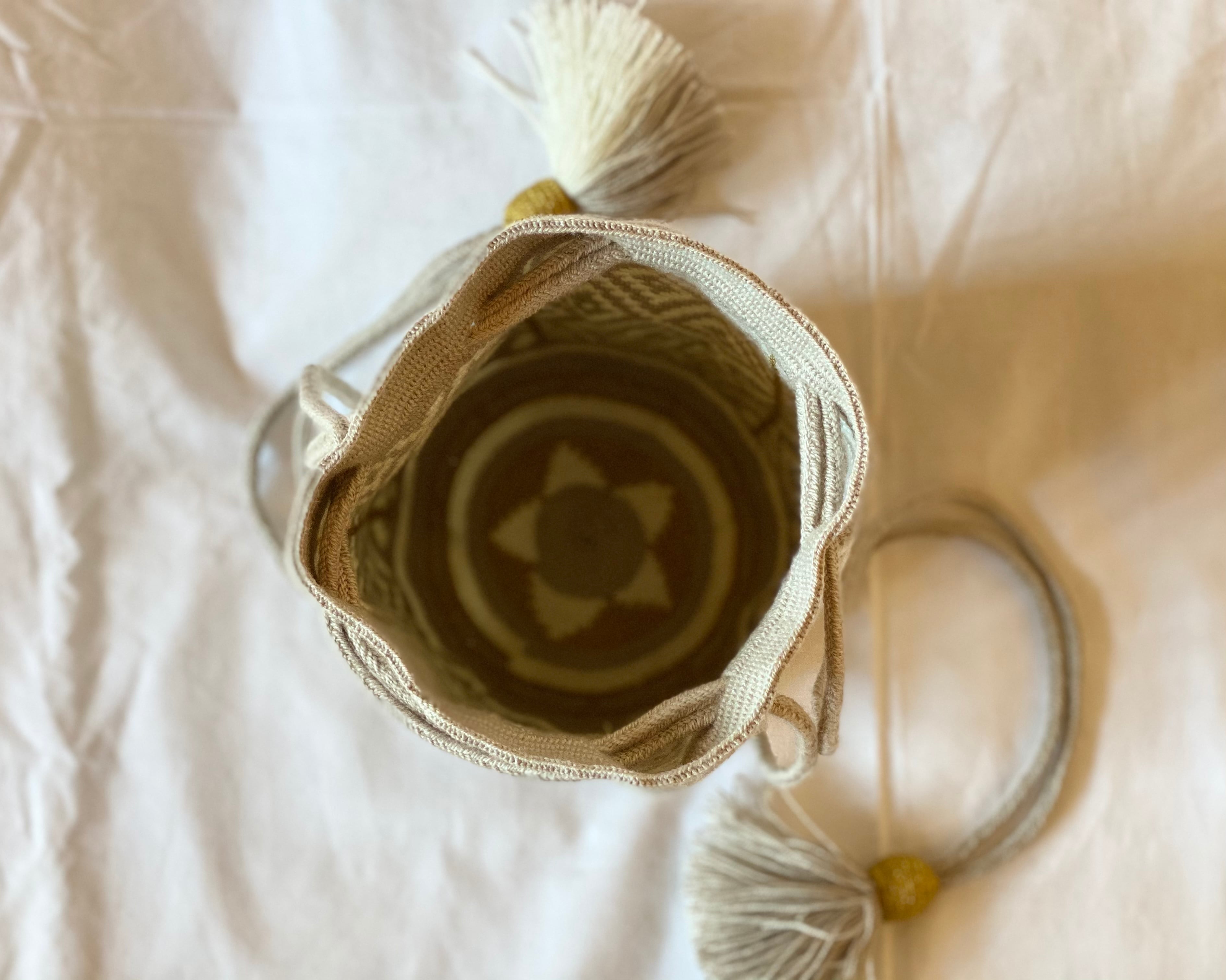 ワユーバックはコロンビア現地の職人によるハンドメイド製品のため、機械で作ったもののように完璧な作りではありません。全て一つ一つ手作りのため、ほつれや結び目等もあります。また、底のデザインやタッセルの仕様が違うこともございます。